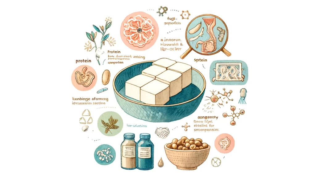 豆腐ようは高タンパク・低カロリーで、イソフラボンやビタミン、ミネラルを豊富に含んでいます。発酵食品としての特性から、腸内環境の改善や免疫力の向上にも効果があります。また、抗酸化作用により老化防止にも役立つとされています。ただし、塩分が高いため摂取量には注意が必要です。