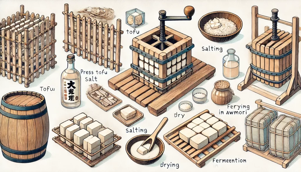 豆腐ようの基本的な作り方は以下の通りです:1. 固めの豆腐を2cm角程度にカットする、2. 塩をまぶして一晩おく、3. 塩抜きした後、2〜3日乾燥させる、4. 泡盛に漬け込む、5. 3〜6ヶ月程度熟成させる。この過程で、豆腐は独特の風味と食感を持つ豆腐ようへと変化していきます。