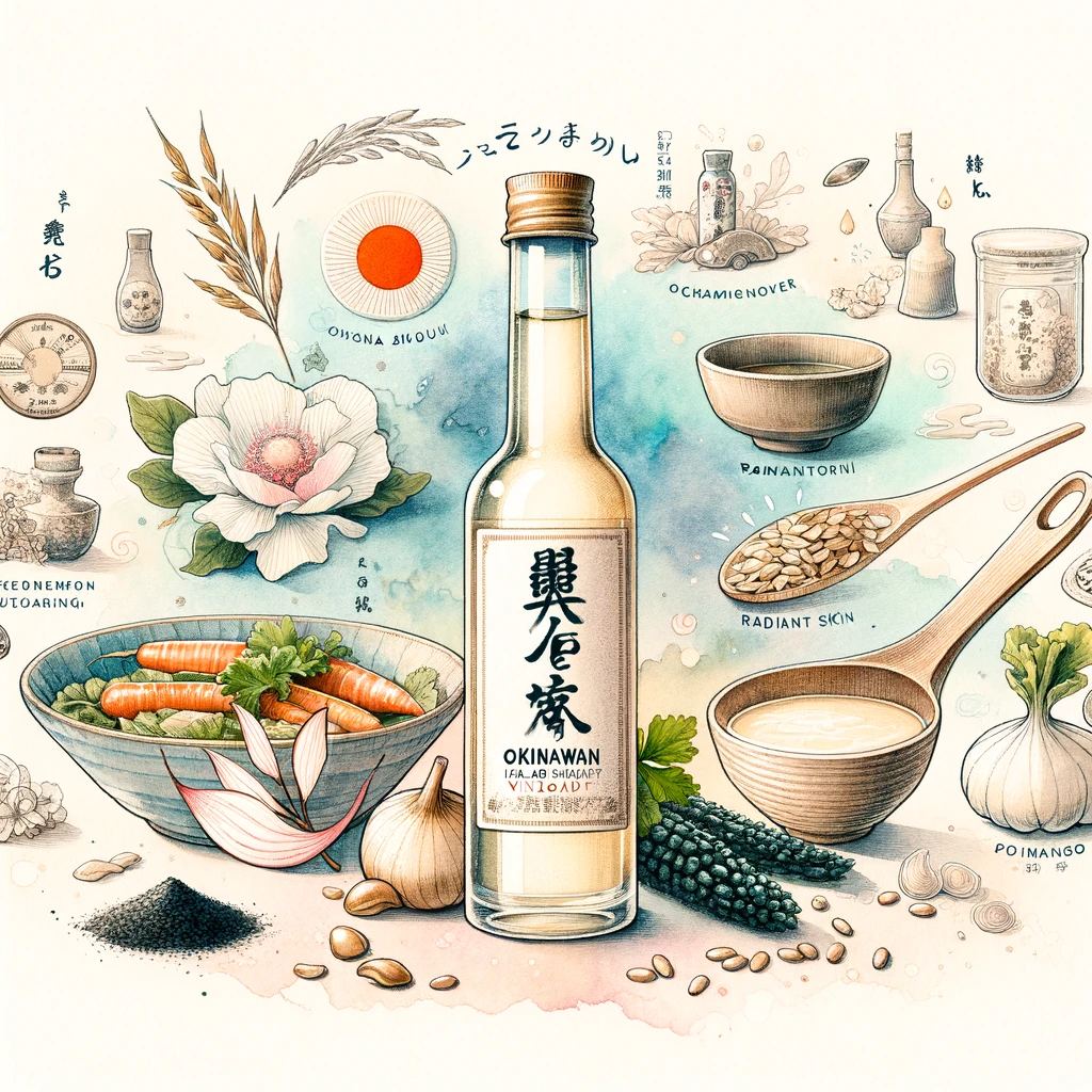 Shimazui (Island Vinegar) is a traditional Okinawan condiment with unique flavor and rich nutrients. Made from rice and fermented with black koji mold, Shimazui has mild acidity and fruity aroma, essential in Okinawan cuisine.