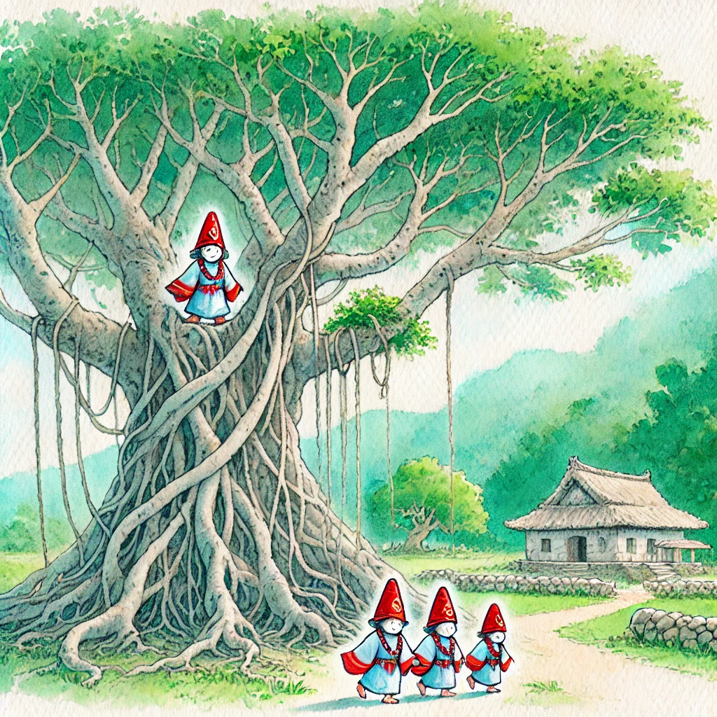 Kijimuna are said to take the form of children wearing red caps. They are known to offer advice to humans and sometimes play tricks, embodying a somewhat whimsical nature.