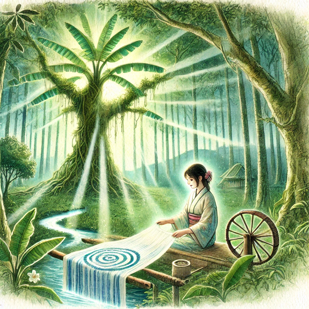 One day, Misako discovered an old banana tree in the forest that emitted a mystical aura. Drawn by this strange power, she began to harvest the fibers from the tree and weave them into cloth.