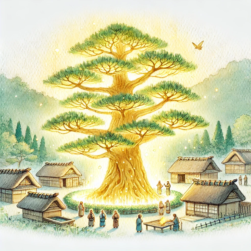 Since then, the legend of the Golden Pine’s curse has spread. It is said that while the Golden Pine might grant greedy wishes, those who make such wishes will ultimately turn into pine trees as a consequence.